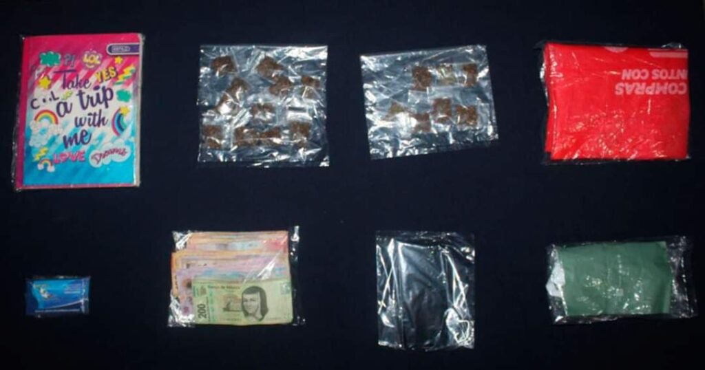 Al momento de la revisión, a Yadira y Camila les encontraron en su poder 18 bolsitas de marihuana, 24 mil 920 pesos en efectivo, una bolsa de tela roja, una bolsa de cartón verde, 27 tarjetas de color azul con la leyenda “Pacífico corporativo empresarial”, una libreta rosa y un teléfono, también les decomisaron los estupefacientes y el resto de los objetos que portaban.