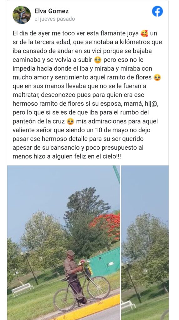 “El día de ayer me tocó ver esta flamante joya, un señor de la tercera edad que se notaba a kilómetros que iba cansado de andar en su bicicleta. Se bajaba, caminaba y se volvía a subir, pero eso no le impedía ir hacia donde él iba y miraba con mucho amor y sentimiento aquel ramito de flores que llevaba en sus manos, asegurándose de que no se maltrataran”, dijo la mujer y compartió las fotos de Aniceto.