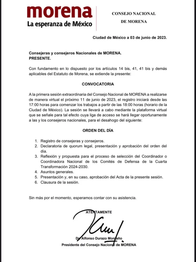 En el orden del día de la próxima reunión, prevista para el 11 de junio a las 17:00 horas (tiempo del centro de México), se pudo leer que se tratan de seis puntos a tratar; no obstante, es el punto número tres el que se roba los reflectores, debido a que se trata del análisis para elegir al coordinador o coordinadora nacional de los Comités de Defensa de la Cuarta Transformación.