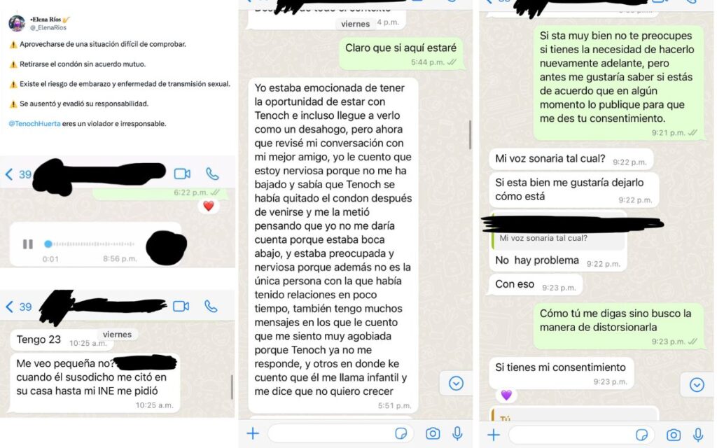 “Yo estaba emocionada de tener la oportunidad de estar con Tenoch e incluso llegue a verlo como un desahogo, pero ahora que revisé mi conversación con mi mejor amigo, yo le cuento que estoy nerviosa porque no me ha bajado y sabía que Tenoch se había quitado el condón después de venirse y me la metió pensando que yo no me daría cuenta porque estaba boca abajo, y […] le cuento que me siento muy agobiada porque Tenoch ya no me responde, y otros en donde le cuento que él me llama infantil y me dice que no quiero crecer”, se lee en las capturas de pantalla.