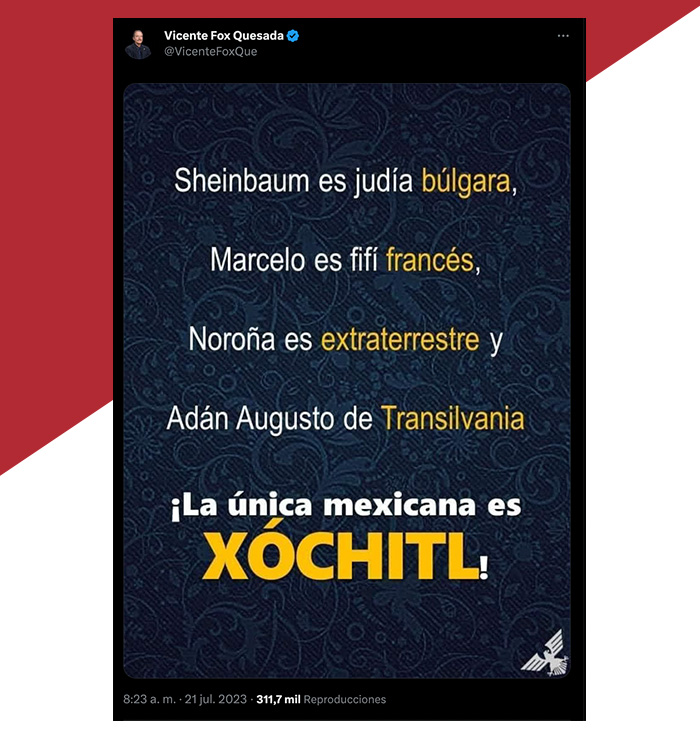 Este viernes, el expresidente Vicente Fox Quesada sorprendió en redes sociales al publicar un mensaje dirigido a los aspirantes a la candidatura presidencial de Morena rumbo a los comicios del 2024, imagen que usuarios en Twitter han calificado como antimsemita, ofensivo y xenófobo.