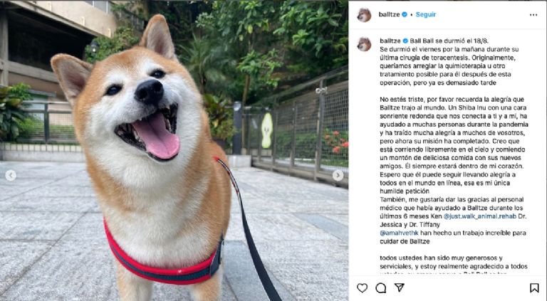 “No estés triste, por favor recuerda la alegría que Balltze trajo al mundo. Un Shiba Inu con una cara sonriente redonda que nos conecta a ti y a mí, ha ayudado a muchas personas durante la pandemia y ha traído mucha alegría a muchos de ustedes, pero ahora su misión ha completado”, se lee en parte del escrito que ha llenado de melancolía a los millones de fanáticos que acumuló al rededor del mundo.