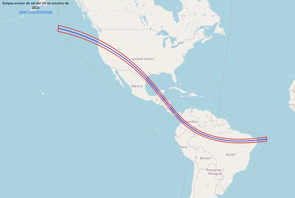 El portal eclipse2024.org, al igual que otros dedicados a compartir información sobre estos fenómenos, muestra que la visibilidad del eclipse solar anular de octubre traza una línea con dos curvas que abarca una franja de Estados Unidos, surca la península de Yucatán, pasa por todo Centroamérica, Colombia y Brasil.