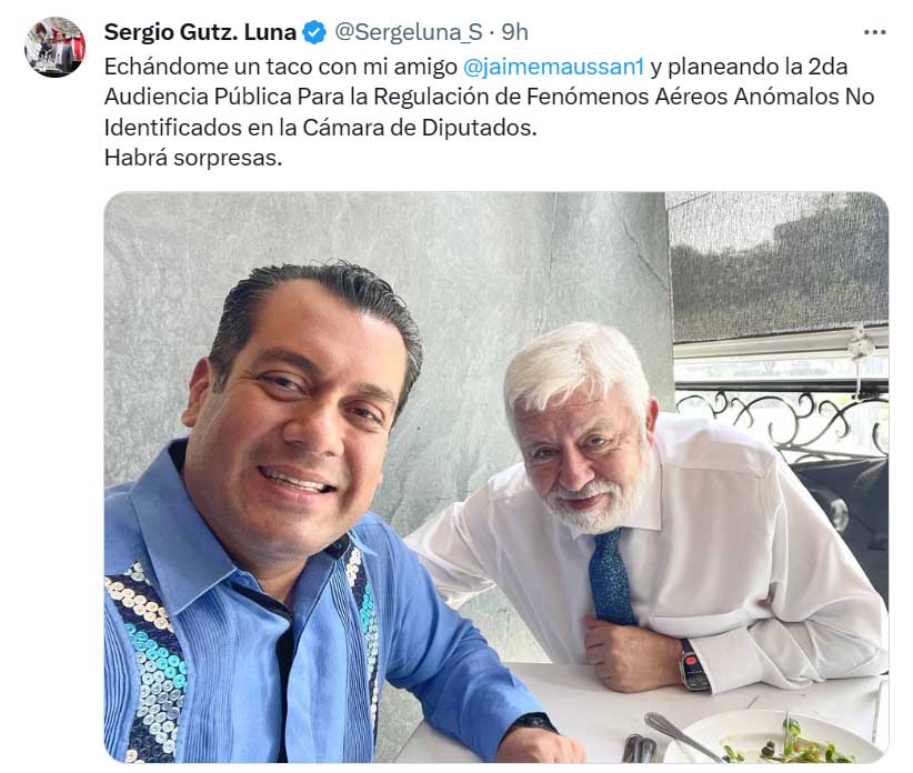 “Echándome un taco con mi amigo Jaime Maussan y planeando la 2da Audiencia Pública Para la Regulación de Fenómenos Aéreos Anómalos No Identificados en la Cámara de Diputados”, dijo.