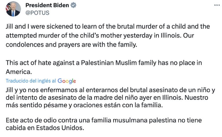 El presidente Joe Biden, también lamentó lo sucedido a través de un mensaje en Twitter: “este horrible acto de odio no tiene lugar en Estados Unidos y va en contra de nuestros valores fundamentales: la libertad del miedo por cómo oramos, qué creemos y quiénes somos”, escribió el mandatario. “Jill y yo nos enfermamos al enterarnos del brutal asesinato de un niño y del intento de asesinato de la madre del niño ayer en Illinois. Nuestras condolencias y oraciones están con la familia. Este acto de odio contra una familia musulmana palestina no tiene cabida en Estados Unidos”, agregó.
