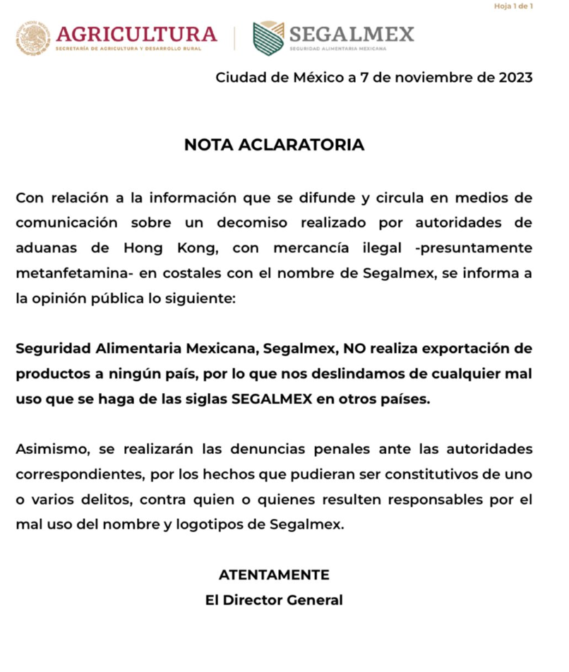 El organismo descentralizado Seguridad Alimentaria Mexicana (Segalmex) se deslindó del decomiso de metanfetamina oculta en conchas de caracol realizado en Honk Kong, procedente de México.